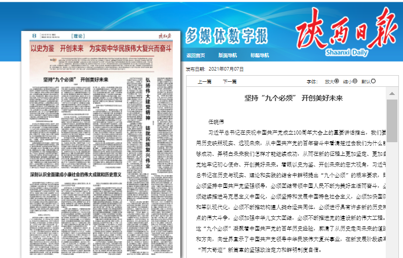 百年恰是风华正茂。百年征程中,正是在中国共产党的领导下,中华民族迎来了从站起来、富起来到强起来的伟大飞跃,中国日益走近世界舞台中央。凡是过往,皆为序章。中国共产党是一个永不懈怠的马克思主义政党,面对全面建设社会主义现代化国家、实现中华民族伟大复兴这个伟大而艰辛的目标,必须要以永远在路上的清醒与自觉,继续走好新时代的历史必由之路,创造出更加美好的未来。走好新时代的历史必由之路,关键是要坚持中国特色社会主义道路,倍加珍惜中国共产党领导中国人民在长期实践中逐步开辟出来的这条民族复兴之路、国家富强之路、人民幸福之路。走好新时代的历史必由之路,关键是要坚持“九个必须”,一方面用“九个必须”提升新时代中国特色社会主义事业的发展水平,另一方面在新时代中国特色社会主义事业中把“九个必须”的实践水平提升到新的高度。1949年新中国成立前夕,毛泽东在党的七届二中全会上的讲话中指出:“夺取全国胜利,这只是万里长征走完了第一步。如果这一步也值得骄傲,那是比较渺小的,更值得骄傲的还在后头。”在新中国70多年的历史发展中,毛泽东的这一告诫一直激励着中国共产党人在戒骄戒躁中埋头苦干,把每一个阶段取得的成就都看作是实现下一阶段更伟大成就的基础,不断推动着中华民族伟大复兴的历史进程。在这一政治逻辑中,毫无疑问,“九个必须”必将激励全党在新征程上更加坚定、更加自觉地牢记初心使命、开创美好未来,沿着历史必由之路创造出“更值得骄傲的”辉煌未来。