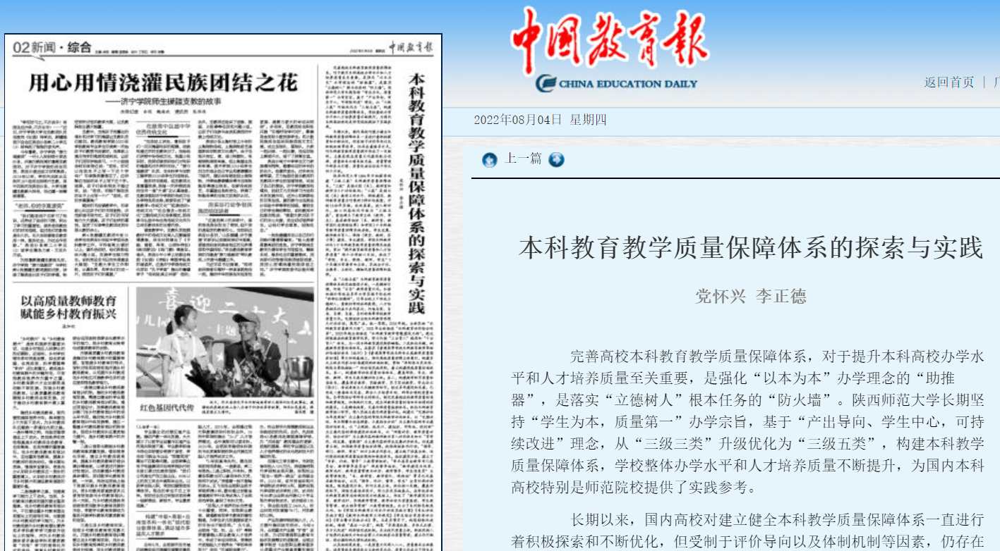 师大新闻网讯 8月4日出版的《中国教育报》在第2版刊登了我校副校长党怀兴和教务处李正德的署名文章“本科教育教学质量保障体系的探索与实践”。文章指出,陕西师范大学长期坚持“学生为本,质量第一”办学宗旨,基于“产出导向、学生中心,可持续改进”理念,从“三级三类”升级优化为“三级五类”,构建本科教学质量保障体系,学校整体办学水平和人才培养质量不断提升,为国内本科高校特别是师范院校提供了实践参考。