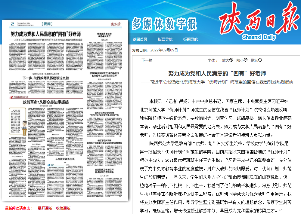陕西师范大学是教育部“优师计划”首批招生院校,学校数学与统计学院是第一批招录“优师计划”师范生的学院,目前共招收来自祖国各地的“优师计划”师范生48人。2021级优师班班主任王光生说:“习近平总书记的重要寄语,充分体现了党中央对教育事业的高度重视,对广大教师的深切厚爱,对‘优师计划’师范生的殷切期望。一年以来,学生们从刚入学时的稚嫩懵懂到现在的成熟稳重,像一粒粒种子一样向下扎根、向阳生长,我看到了他们的成长和进步,深感欣慰。师范生技能需要在不断听课和试讲中去积累,优师班同学成长为优秀教师任重道远,我将充分发挥班主任作用,引导学生坚定到基层教书育人的理想信念,带领学生刻苦学习,砥砺品格,增长传道授业解惑本领,早日成为党和国家的栋梁之才。”