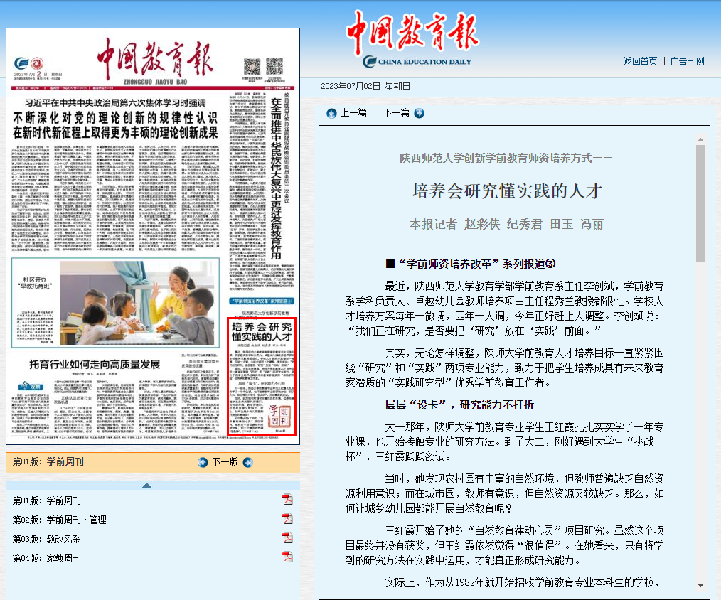师大新闻网讯 7月2日,《中国教育报》以“陕西师范大学创新学前教育师资培养方式——培养会研究懂实践的人才”为题,从“层层‘设卡’,研究能力不打折”“贯通式见习,实践能力不‘缺腿’”“在实践中持续研究,走向卓越”三个方面,对我校教育学部学前教育专业公费师范生的人才培养模式和成效进行了报道。