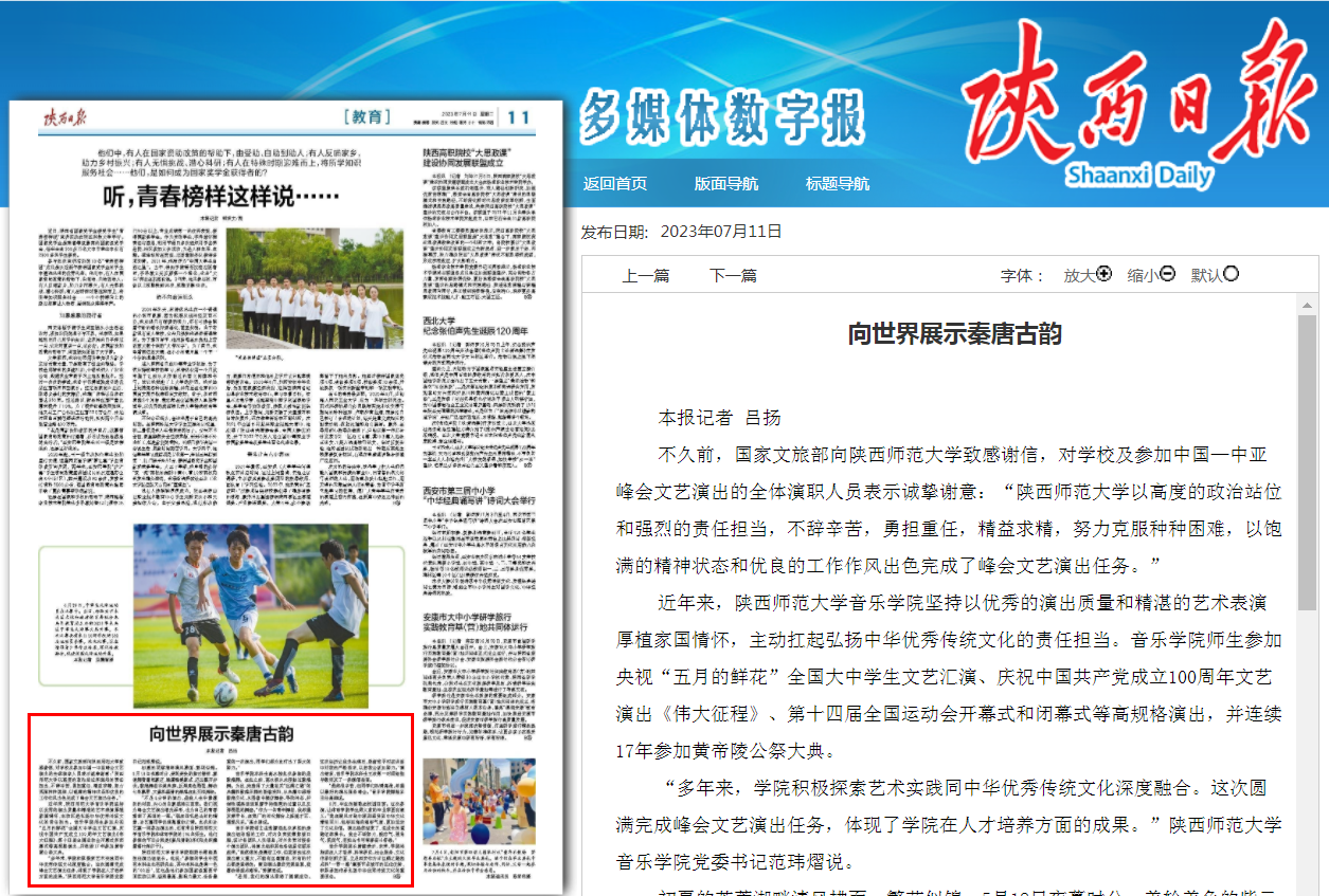 师大新闻网讯 7月11日,《陕西日报》刊登题为“向世界展示秦唐古韵”的报道文章,对我校音乐学院和体育学院师生不辞辛苦,勇担重任,精益求精,努力克服种种困难,以饱满的精神状态和优良的工作作风出色完成了中国-中亚峰会文艺演出任务进行报道,彰显了我校积极承担传承弘扬中华优秀传统文化的使命担当。