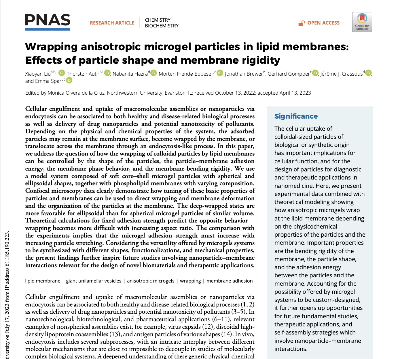 细胞通过胞吞作用吞噬和摄取大分子组装体或胶体纳米颗粒与药物递送、医学诊疗、以及纳米颗粒的潜在毒性密切相关。胞吞作用受到体系的物理和化学属性影响,附着在细胞膜上的纳米颗粒可能稳定吸附在膜表面、或者被膜包裹、也可能穿过细胞膜进入细胞内部。此研究通过设计合成各向异性的纳米颗粒和合成细胞膜研究了胶体颗粒与脂质膜的相互作用,致力于揭示胞吞作用受纳米颗粒和细胞膜物理和化学属性影响的规律。