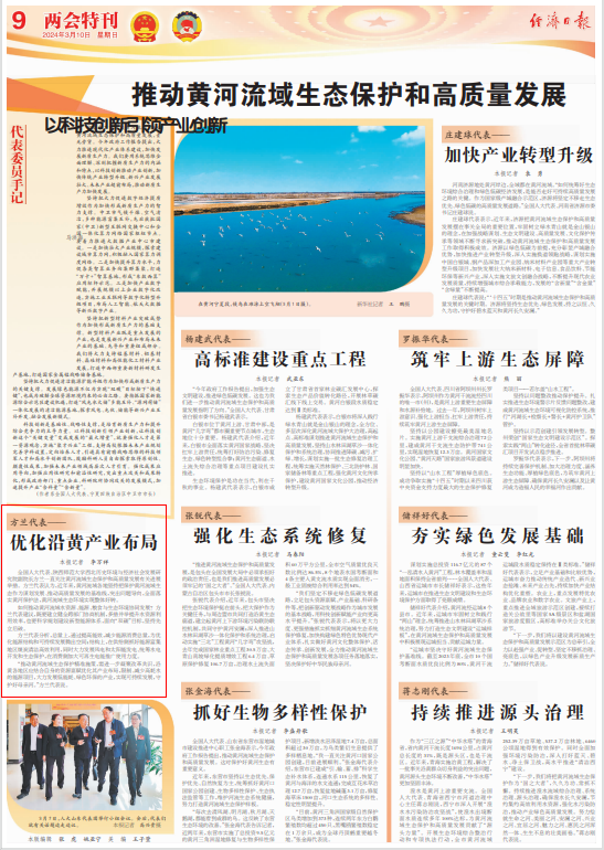 “推动黄河流域生态保护精准施策,需进一步凝聚改革共识,沿黄各地区应结合自身的资源禀赋优化其产业布局,限制、减少高耗水的能源项目,大力发展低能耗、绿色环保的产业,实现可持续发展,守护好母亲河。”方兰代表说。