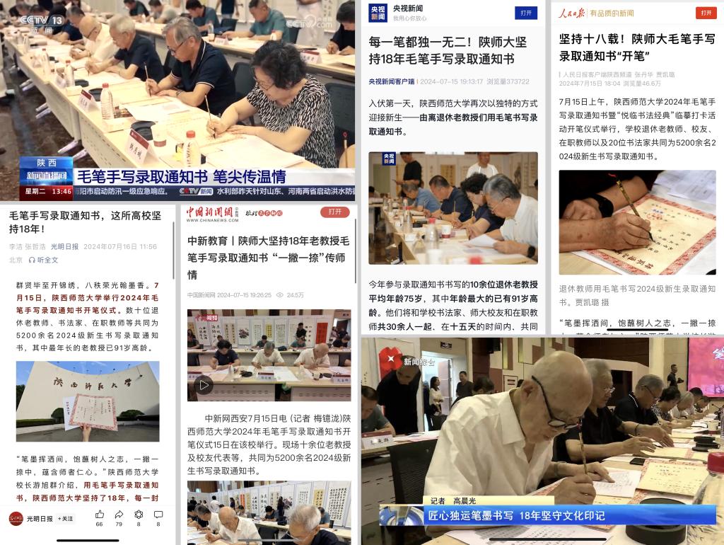 师大新闻网讯 7月15日,我校举行2024年毛笔手写录取通知书暨“悦临书法经典”临摹打卡活动开笔仪式。学校退休老教师、在职教师、校友、校外书法家等齐聚一堂,共同为5200余名2024级新生书写录取通知书。今年,是我校第18年坚守毛笔手写录取通知书。18年的坚守,是文化的传承,是精神的传递,更是对教育事业的无限热爱与奉献。每一封录取通知书,都蕴含着对即将踏入陕师大校门的学子们的深情祝福与殷切期盼。人民日报、光明日报、央视新闻频道、央视新闻、人民网、中国新闻网、群众新闻等10余家中省主流媒体对此进行宣传报道,引起广泛良好的社会反响。