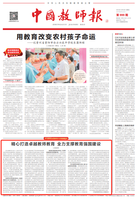 师大新闻网讯 10月23日,《中国教师报》在头版刊登了我校副校长陈新兵的文章《精心打造卓越教师教育 全力支撑教育强国建设》。文章从“持续优化师范教育体系,凸显教师教育立校之本重要地位”“继续彰显教师教育特色,引领西部基础教育高质量发展”“深化教师培养模式改革,提升卓越教师培养质量”三个方面阐述了我校始终坚守教师教育主责主业,持续深化新时代卓越教师培养改革,全力支撑教育强国建设的使命担当。
