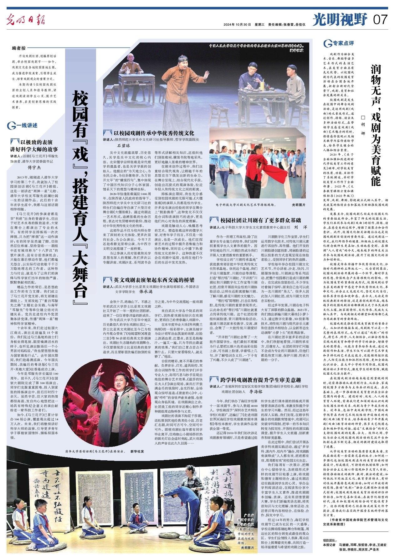 师大新闻网讯10月30日,《光明日报》第7版“一线讲述”栏目以《校园有“戏”,搭建育人“大舞台”》为题,约请5位校园戏剧社团的主创人员和指导教师,讲述戏剧浸润学生心灵、提升艺术素养、启发创新思维的实践探索。其中“以校园戏剧传承中华优秀传统文化”讲述了我校关中文化研习社的师生自编自导自演大型历史舞台剧《大儒张载》,通过戏剧这一艺术形式,表达对先贤精神的敬仰,推动对中华优秀传统文化的传承。