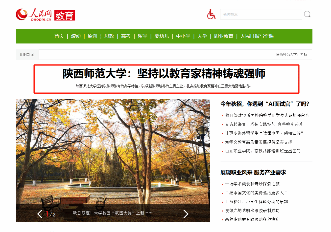 师大新闻网讯11月8日,人民网教育频道刊发我校党委书记李晓兵、校长游旭群的署名文章《陕西师范大学:坚持以教育家精神铸魂强师》。文章从“坚持以教育家精神铸就师魂匠心”“坚持以教育家精神引领卓越教师培养”“坚持以教育家精神谱写强师报国新篇章”三个方面阐述了近年来我校坚持以教师教育为办学特色,以卓越教师培养为主责主业,扎实推动教育家精神在三秦大地落地生根的使命担当。
