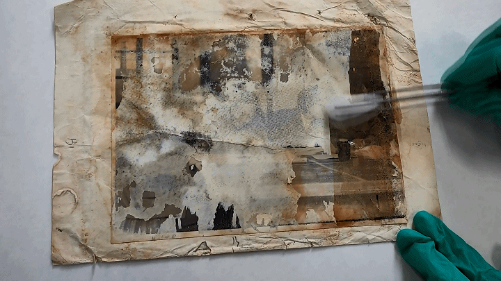 李玉虎回忆初见照片时的情景说:“照片加在两片玻璃间,相纸老化严重,正面影像层已经粘在玻璃上,一碰就碎。”团队研判后,决定用微米级液雾喷洒照片背面,让显现加固剂缓慢渗透影像层,在修复同时增强照片强度与韧性。