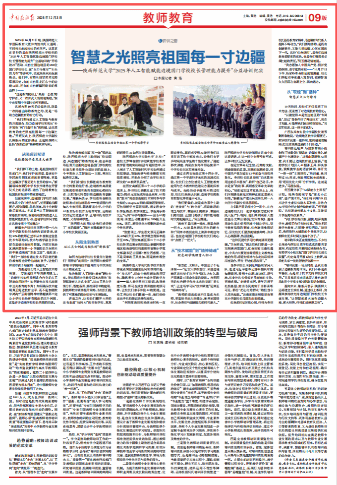 师大新闻网讯12月3日,《中国教师报》以“智慧之光照亮祖国每一寸边疆——陕西师范大学2025年人工智能赋能边境国门学校校长管理能力提升公益培训纪实”为题,报道陕西师范大学积极服务国家“稳变固边、兴边富民”战略,担当教育强国建设使命,以数智化转型引领服务边疆教育高质量发展。