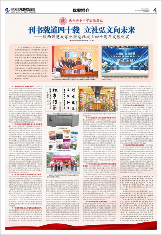 四十年植根陕西师大校园,筑牢教育出版根基。总社坚守高校出版工作的正确方向,始终与学校事业发展同频共振,自觉将学校学科优势转化为精品出版优势。聚焦教师教育主责主业,多年推出多部学校学者的学术专著和教材,《河山集》获教育部优秀学术著作特等奖,《学前教育学》等多个项目入选国家规划教材。持续开展刊院共建,以双效回馈学校发展。与学校各院系合作出版的中学教学参考系列期刊已有53年的办刊历史,8种期刊全部被国家主管部门认定为学术期刊,其中7种期刊先后26次入选“全国中文核心期刊”,8种期刊第8次全部入选人大复印报刊资料重要转载来源期刊。“哪里有中学,哪里就有中教参”享誉全国基础教育界,成为总社和学校的宝贵财富。总社牵头组建陕西师范大学基础教育研究院,开展教育课题研究、教师教育研讨活动,携手各期刊编辑部举办培训活动千余场,惠及教师百万余人次,受到中学教师的广泛支持与好评。牵头组建陕西师范大学出版传媒研究院,联合申报出版专业博士点获批,以产学研用相结合实现服务升级,助力学校“双一流”建设。搭建多个“走出去”平台,服务学校国际交流与合作。全方位服务学校人才培养、科学研究、社会服务、文化传承创新与国际交流合作,是学校服务教育强国建设的一张亮丽名片。