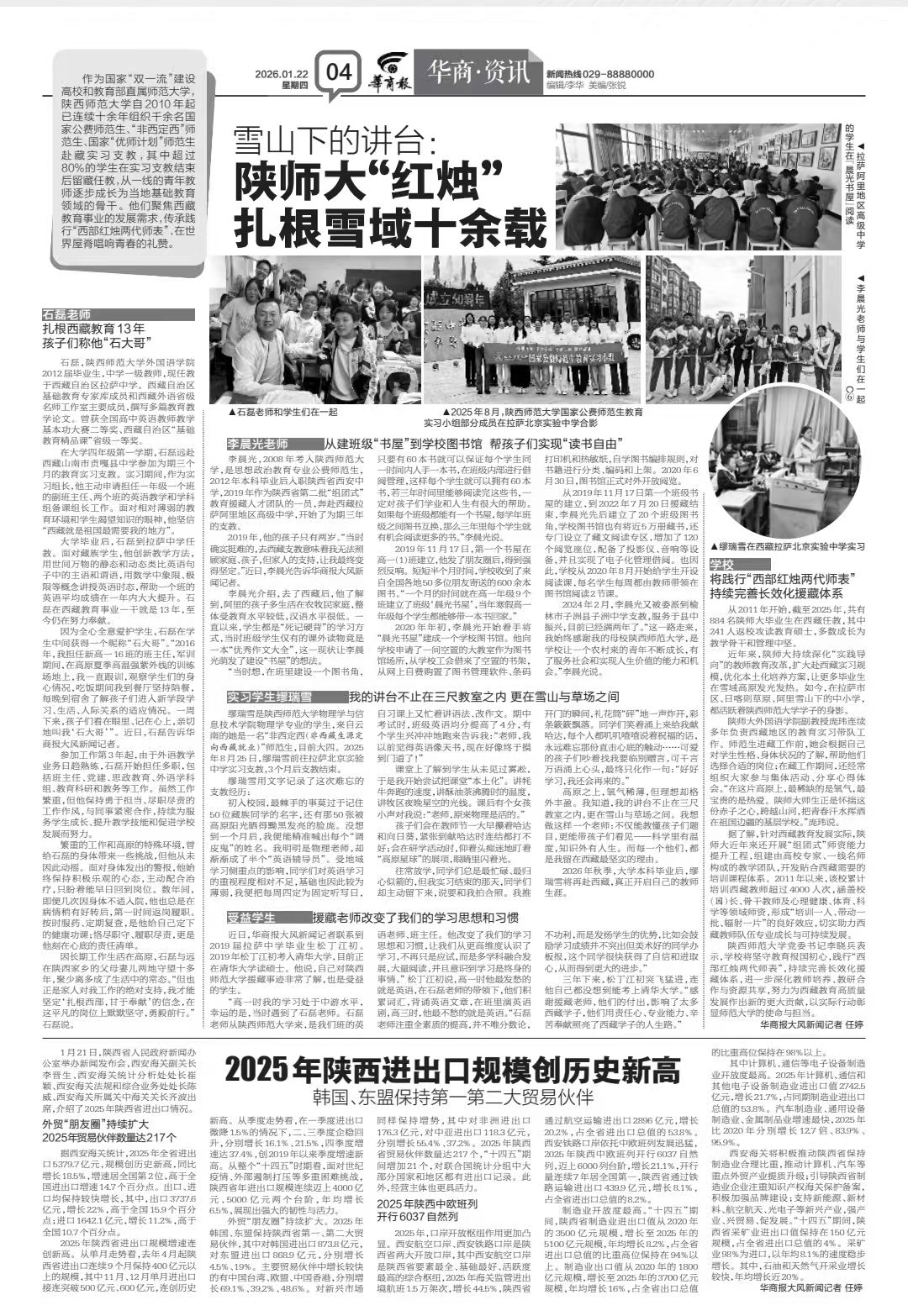 师大新闻网讯1月22日,《华商报》04版刊发题为《雪山下的讲台:陕师大“红烛”扎根雪域十余载》的报道文章。文章以多位长期留藏任教的校友为例,展现了他们如“红烛”般在高原默默发光、以教育照亮学生未来的奉献精神,彰显了我校为西部边疆基础教育事业发展所贡献的持续力量。