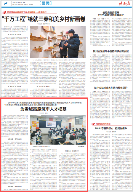 师大新闻网讯1月20日,《陕西日报》以《为雪域高原筑牢人才根基》为题,报道了我校通过系统化教育援藏为西藏培养输送大批高素质教师的长期实践。文章重点阐述了我校将师范生培养与西藏教育实际需求相结合的模式,从招生倾斜、定制培养到实习支教、跟踪支持,形成了一套“造血式”教育援藏体系,有效助力当地教师队伍建设与教育可持续发展,展现了教育在促进民族地区发展中的基础性作用。