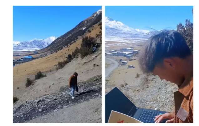 疫情期间,陕师大实习生扎西朗甲在家乡进行线上实习时,上山找信号为学生们上网课。陕西师范大学供图