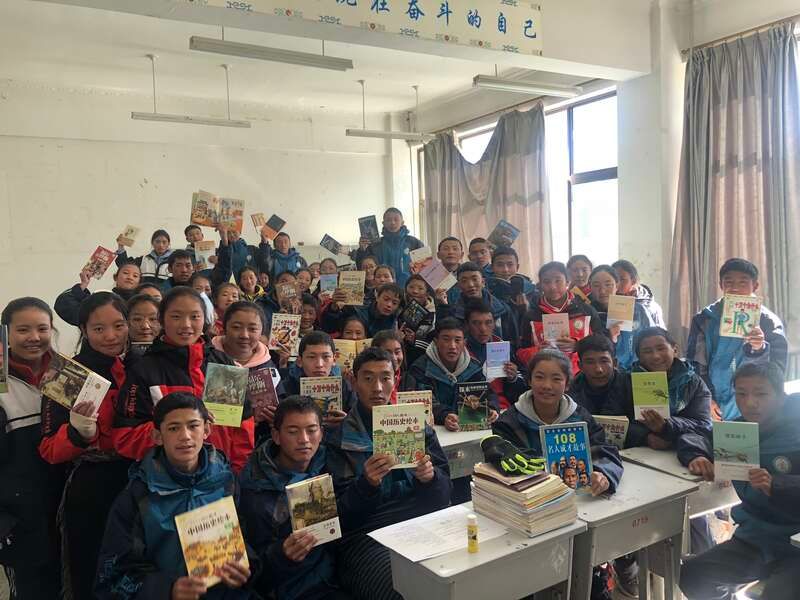 拉萨阿里地区高级中学的学生们从晨光书屋领到图书。受访者供图