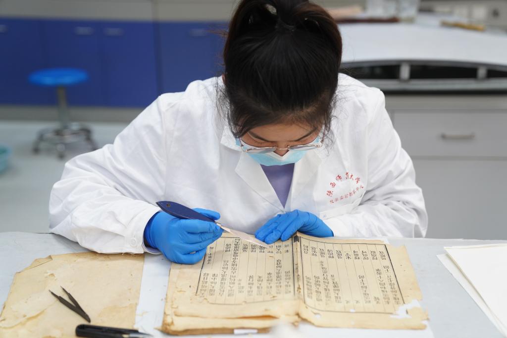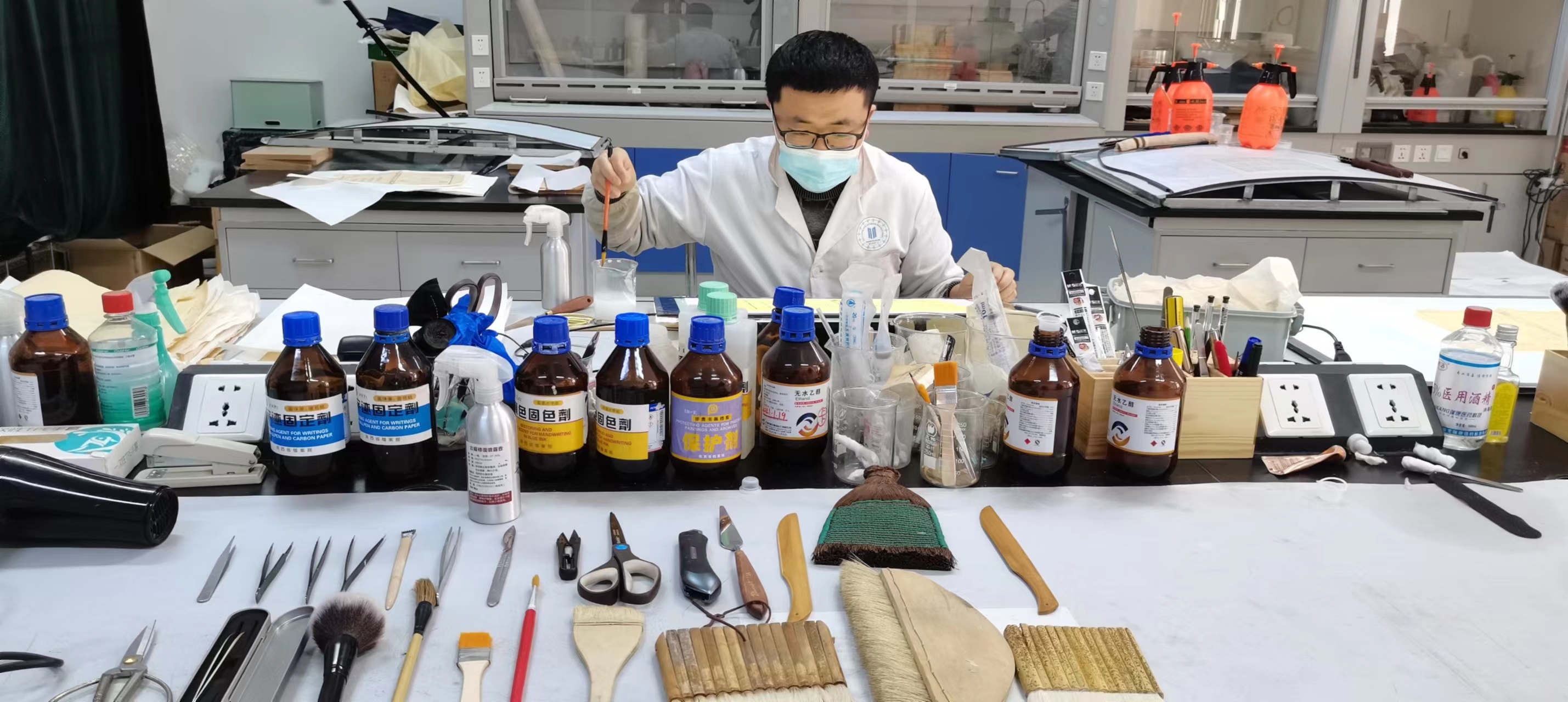 致知楼纸质文献修复与保护研究室,操作台上摆满了镊子、裁板、补书板、毛笔、棕刷、排刷、裁刀、刮刀、剪刀等“十八般武器”,拷贝台上平躺着正在接受“手术”的残卷,木架上整齐堆放着丝网和各类纸张,桌上等待修复的古籍一字排开。