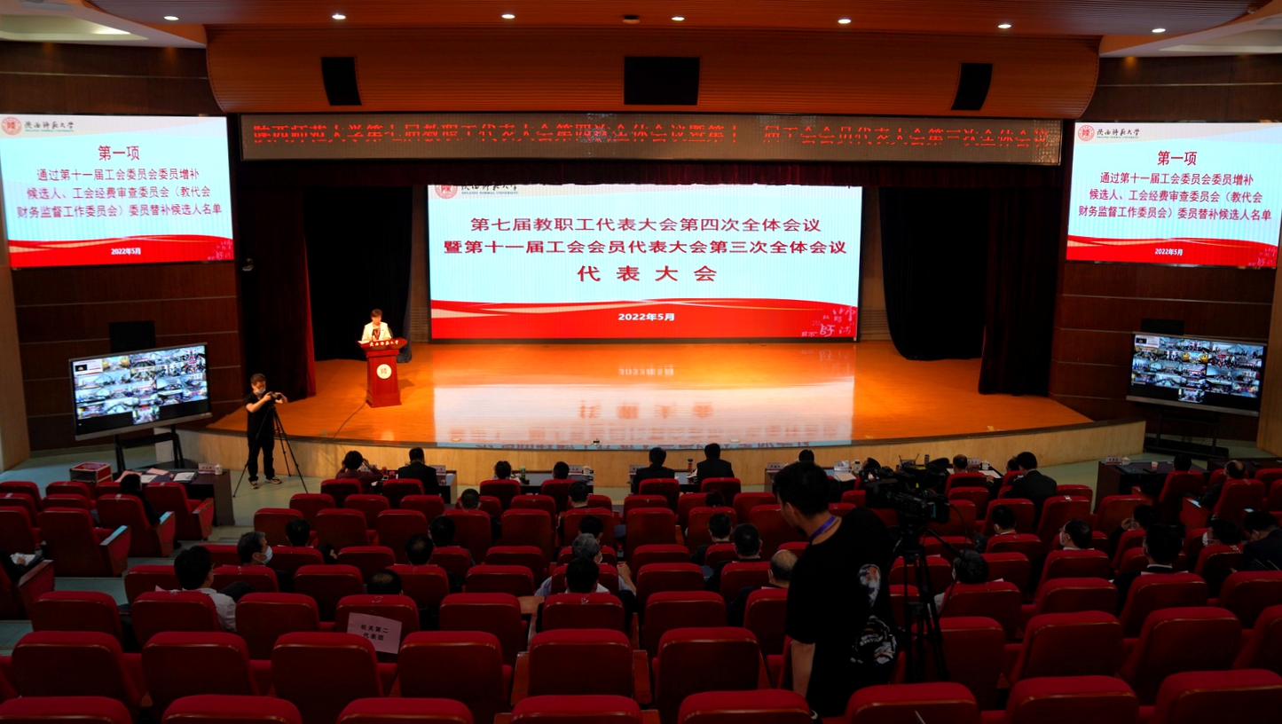 师大新闻网讯 5月15日,我校第七届教职工代表大会第四次全体会议暨第十一届工会会员代表大会第三次全体会议在长安校区新勇学生活动中心举行。会议采取主会场和分会场相结合的方式进行。校党委书记李忠军、校长游旭群等校党政领导、党委常委,正式代表、特邀代表、列席代表等360余人参加了会议。
