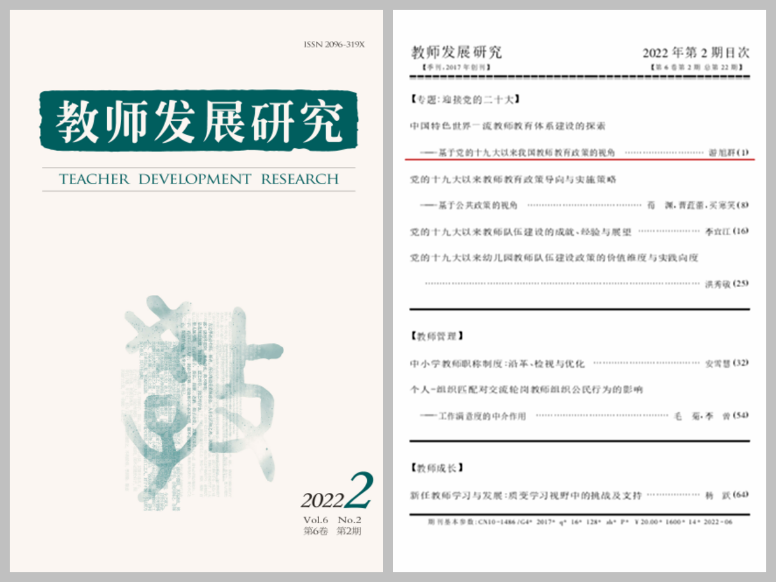 师大新闻网讯 近日,我校校长游旭群在《教师发展研究》杂志撰文,刊登在2022年第2期。文章题为《中国特色世界一流教师教育体系建设的探索——基于党的十九大以来我国教师教育政策的视角》,从“基本形成中国特色世界一流师范教育体系”“健全中国特色教师教育标准体系”“大力弘扬尊师重教的良好社会风尚”三方面,对中国特色世界一流教师教育体系建设作出探索。