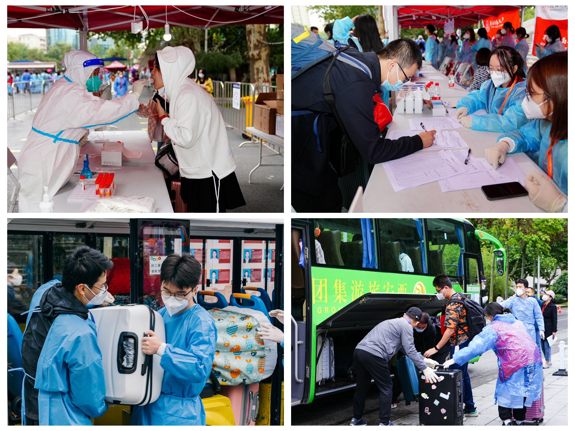 在此等候的志愿者和校卫队员们精神抖擞,帮助何若佳依次完成身份核验、扫码测温、行李消杀、核酸检测、报到办理,用时不到5分钟。