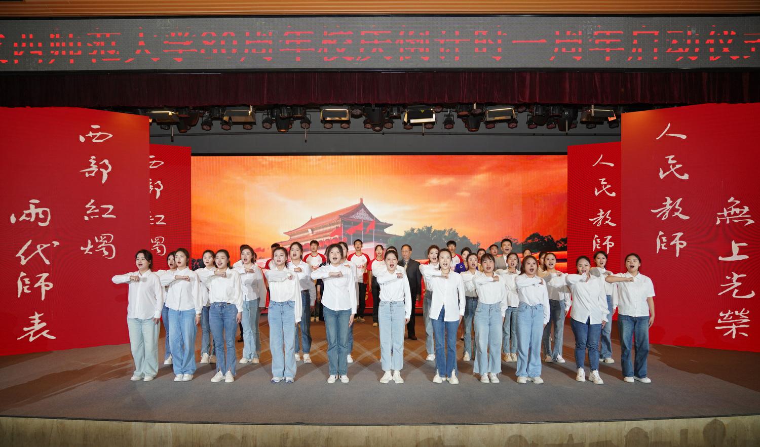 会上,我校各地校友通过视频为母校送上温馨祝福,现场师生校友代表深情唱响《长大后我就成了你》、《走向复兴》,齐声朗诵《西部红烛》,表达了陕西师大人扎根西部、甘于奉献、追求卓越、教育报国的赤胆忠诚和使命担当。