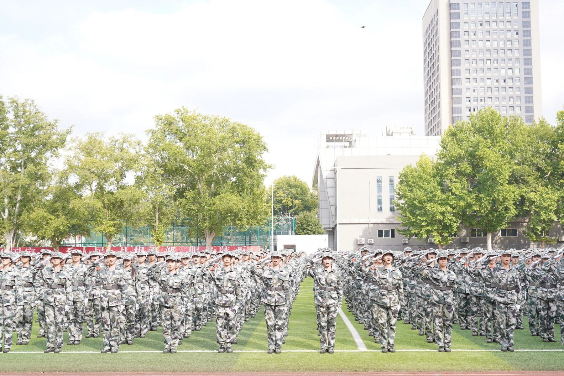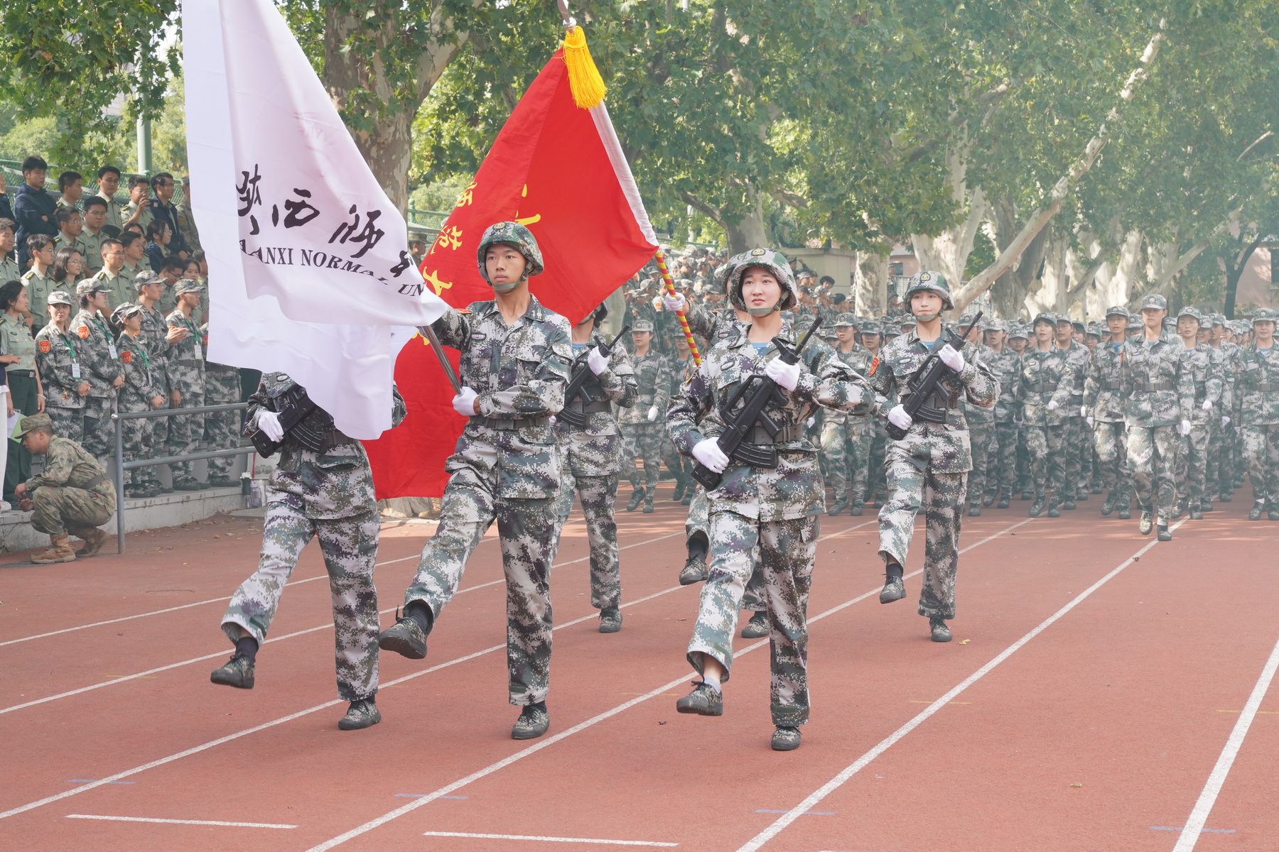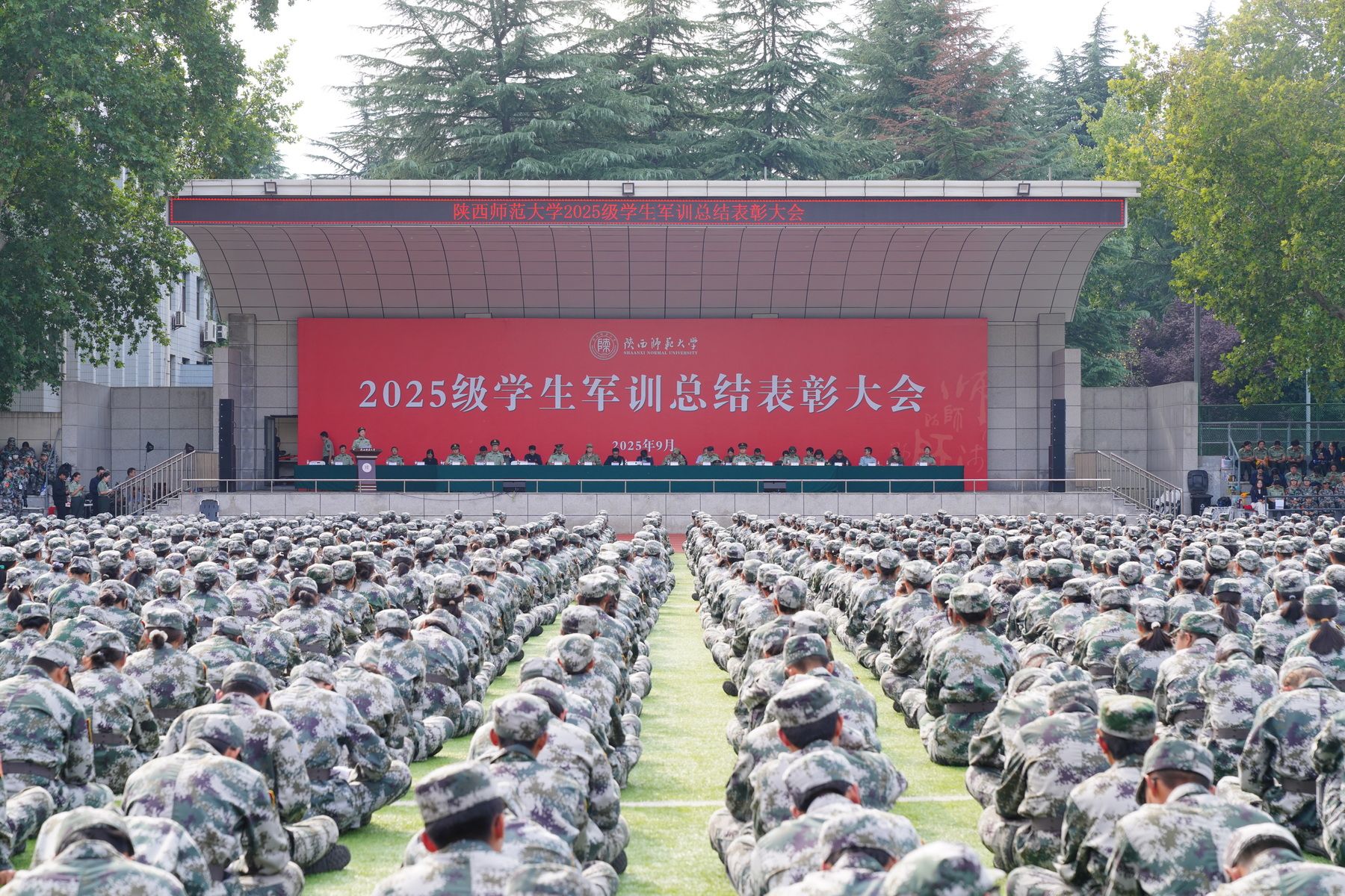师大新闻网讯9月19日下午,我校2025级学生军训总结表彰大会在雁塔校区田径场举行。校党委副书记罗永辉,中国人民解放军陆军边海防学院李玉红大校、刘法语大校、景熠阳少校出席大会。
