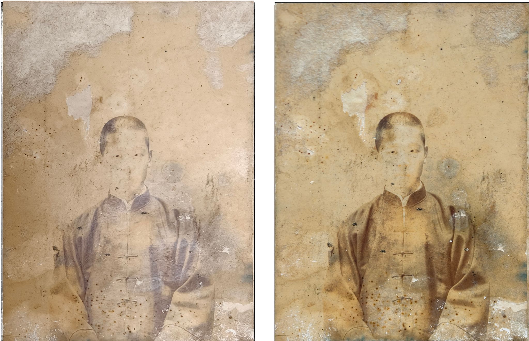 河南省档案馆珍藏的中华国有京汉铁路管理局吴石履历表中,贴有一张4.5cm×6.1cm黑白照片。由于年代久远,照片出现乳剂层粘连、脱落、缺失、模糊、霉斑、污渍等病害,严重影响人像信息的完整呈现与传承利用。为抢救这一重要史料,河南省档案馆将照片送至我校李玉虎教授领衔的感光与纸质档案保护国家档案局重点实验室进行修复。照片档案修复过程中,工作团队严格遵循“最小干预、修旧如旧”的档案保护原则,使用团队研制的显像加固剂,结合“劣化消失原貌显现加固技术”进行去污、祛斑、显影、加固等针对性修复,最大限度恢复原始影像光泽,吴石烈士眼神、表情、衣服、衣扣等细节得以还原,其青年时期的坚定刚毅形象得以重现。