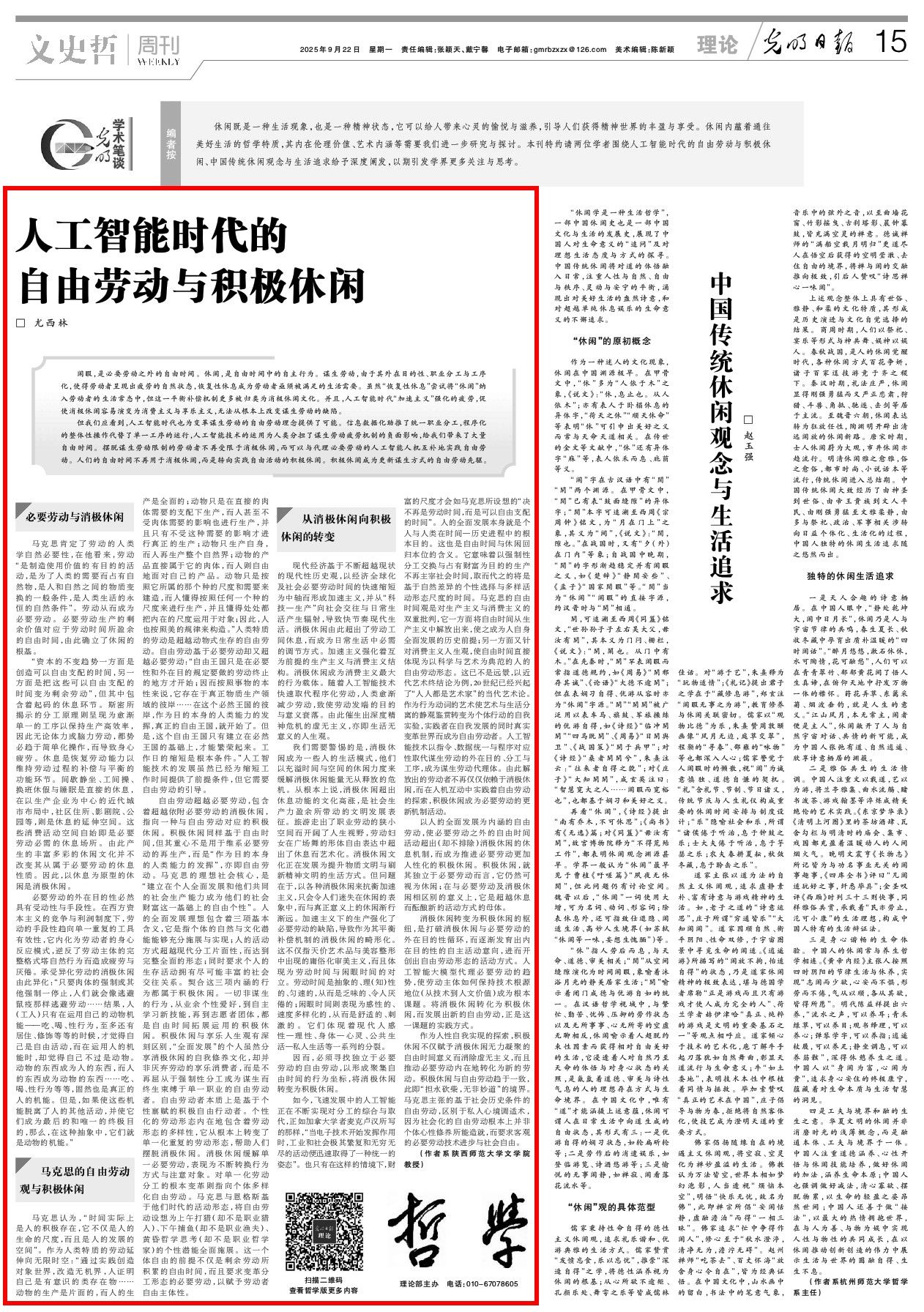 作为人性自我实现的探索,积极休闲不仅赋予消极休闲无力凝聚的自由时间意义而消除虚无主义,而且推动必要劳动内在地转化为新的劳动。积极休闲与自由劳动趋于一致,此即“担水砍柴,无非妙道”的境界。马克思主张的基于社会历史条件的自由劳动,区别于私人心境调适术,因为社会化的自由劳动根本上并非个体心性修养所能造就,而要求客观的必要劳动技术进步与社会自由。(作者:尤西林,系陕西师范大学文学院教授)